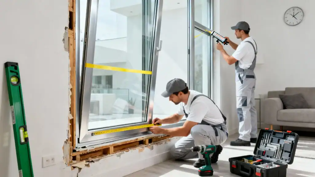 5. Colocación de hojas y ajustes (20–40 min): regulación de herrajes para apertura suave y cierre estanco.